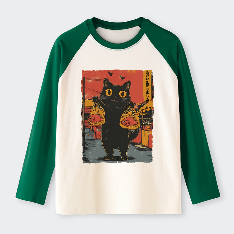 Tokyo-Lion Cat Fishing Japanese Raglan Long Sleeve T-shirt
